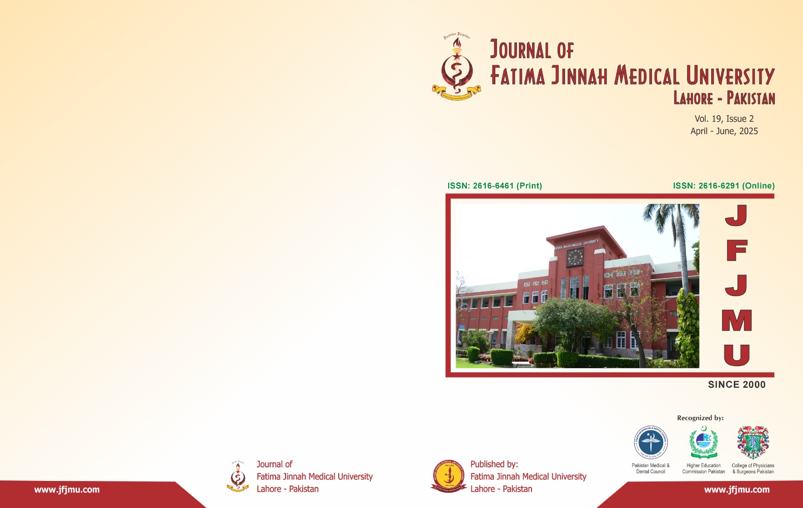 The Journal of Fatima Jinnah Medical University follows the Attribution Creative Commons-Non commercial (CC BY-NC) license which allows the users to copy and redistribute the material in any medium or format, remix, transform and build upon the material. The users must give credit to the source and indicate, provide a link to the license, and indicate if changes were made. However, the CC By-NC license restricts the use of material for commercial purposes. For further details about the license please check the Creative Commons website. The editorial board of JFJMU strives hard for the authenticity and accuracy of the material published in the journal. However, findings and statements are views of the authors and do not necessarily represent views of the Editorial Board.
